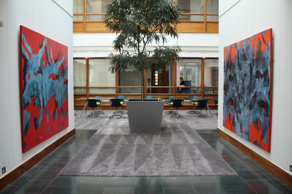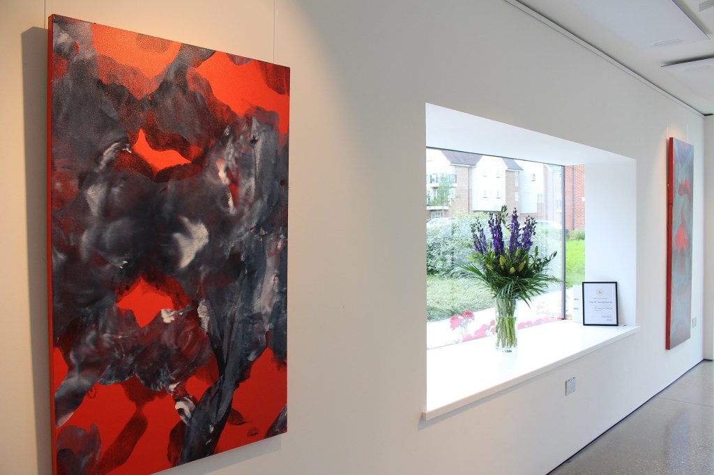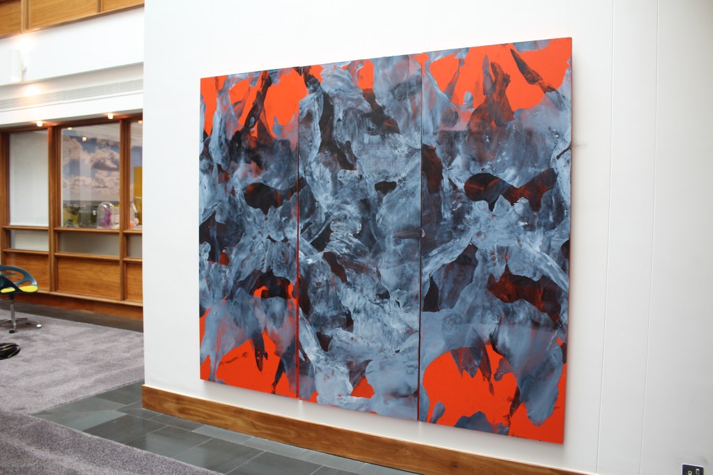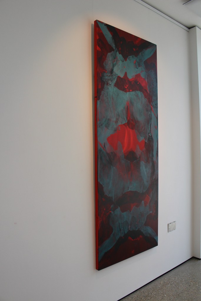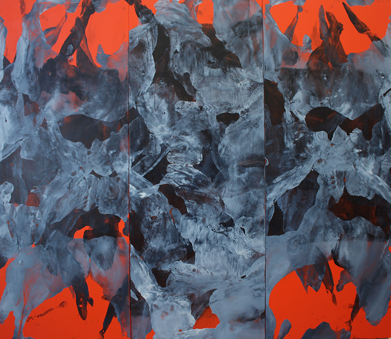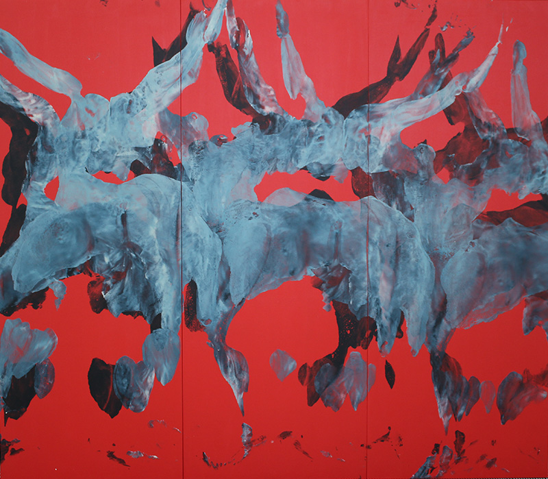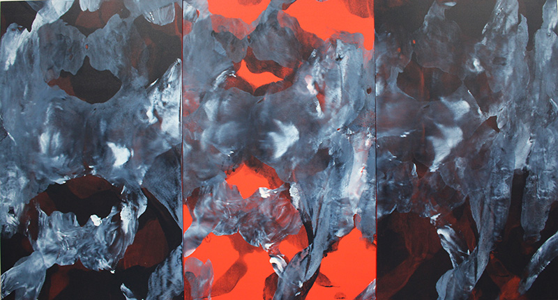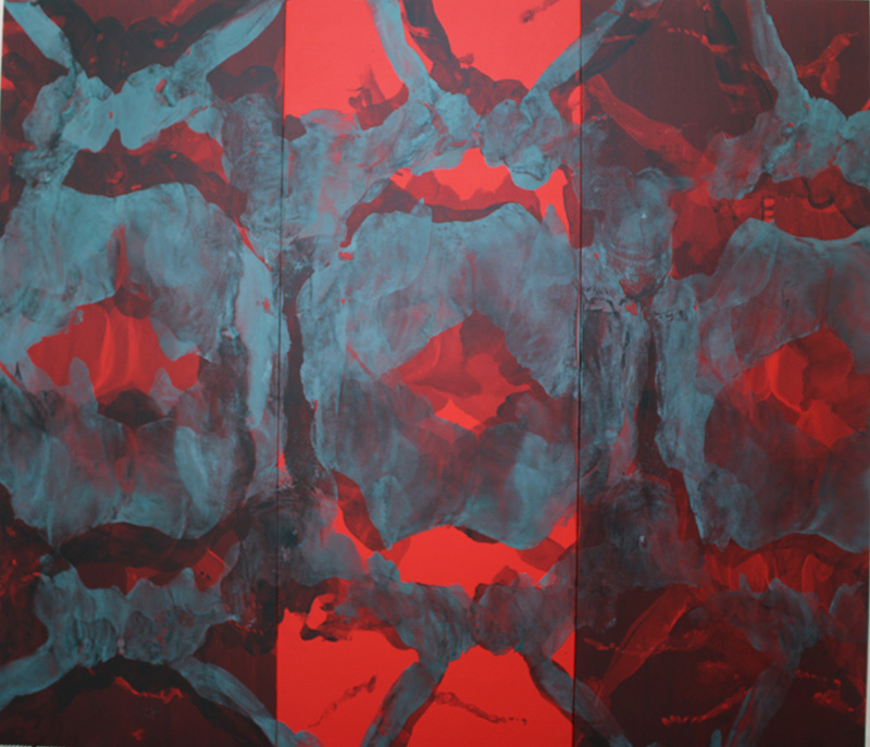 Dasein (Red Triptych), oil and acrylic on ply wood – Three panels of 198 cm x 76cm each